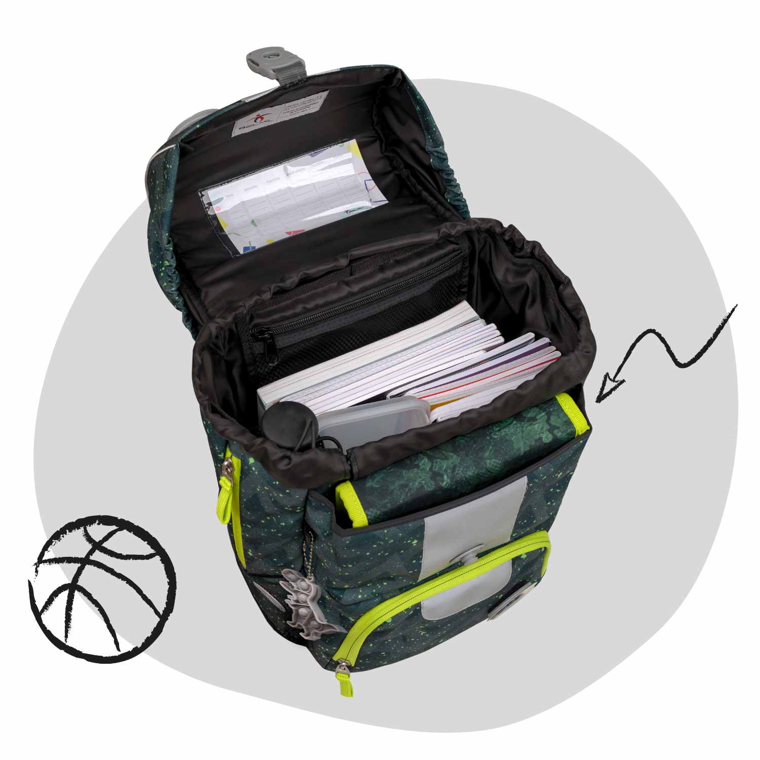 Prostran enterijer sa opcijom za fiksiranje sadržaja, prednji džep sa termo postavom, bočni džepovi sa rajsferšlusom (za kišobran ili flašu vode do 0,7 L) poseban džep za pernicu, dodatni džep na gornjem delu torbe za odlaganje manjih stvari, držač rasporeda časova na poklopcu.